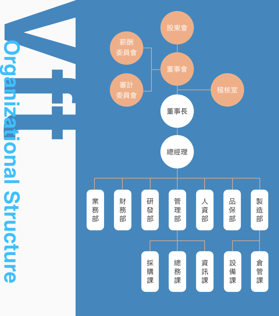 | 管理部 | 負責公司原物料、非生產用品及固定資產之採購暨供應商管理,以及全公司採購資源整合;並且執行負責有關行政、秘書、企劃經營管理,人事及總務等處理。負責公司資訊化政策研訂、資訊系統規畫與維護、網路通信規劃建置與維護等業務。 |